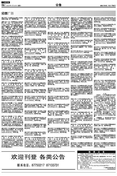 遗失声明 广州淼森实业有限公司遗失发票专用章一枚,现声明作废。 清算公告 广州一举两得进出口贸易有限公司(统一社会信用代码:91440114068658490B)股东决定,本