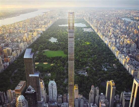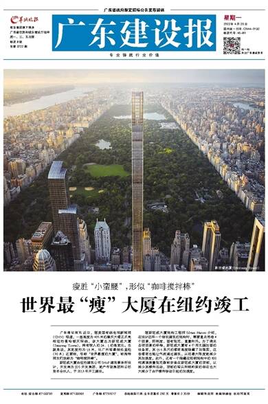 广东建设报讯 近日,据美国有线电视新闻网(CNN)报道,一座高度为435米的摩天大楼正式亮相纽约曼哈顿天际线,该大厦名为斯坦威大厦(Steinway Tower),拥有惊人的24:1的高宽比。也就是说,其宽度约为18米,比广州塔最细处直径(30米)还要细,号称“世界最瘦的大厦”,被推特网友们戏称为“咖啡搅拌棒”。 斯坦威大厦由纽约建筑公司SHoP建筑事务所设计,开发商为JDS开发集团、地产市场集团和云杉资本合伙人,于2013年开工建设。 据斯坦威大厦结构工程师Silvian Marcus介绍,在设计这样一个细长建筑的结构时,需要重点考虑4个因素,即刚度、固有阻尼、重量和风。为了满足各项因素的标准,斯坦威大厦有4个用支腿加固的设备层,其15.5英尺的楼层高度隐藏了加强梁,这些楼层也能让气流通过建筑,从而最大限度地减少其加速度。此外,还有一个隐藏在轻钢结构中的800吨调谐质量阻尼器被安装在斯坦威大厦的顶部,以减少其横向运动,顶部的塔尖和钢桁架的存在也大大减少了由于横向移动引起的加速度。