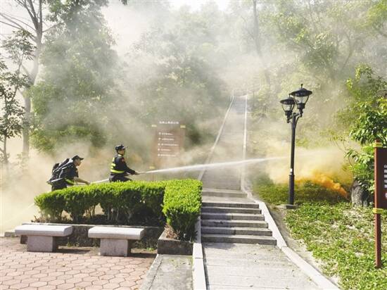 近日,珠海市城市管理和综合执法局指导市属公园管养单位在板樟山森林公园开展森林防火应急演练。现场模拟火情为板樟山森林公园回归路750级附近有烟雾冒起,白莲洞公园和炮台山公园应急队员赶到起火点,集中扑火5分钟将全部火星扑灭,并喷淋周边林地,防止火星反扑。 (唐培峰)