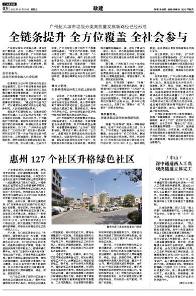 广东建设报讯 记者陈小珊、通讯员成广聚报道:近日,记者从广州市城市管理和综合执法局获悉,广州积极推动垃圾分类从全社会共识向全社会行动转变,形成了垃圾分类“全链条提升、全方位覆盖、