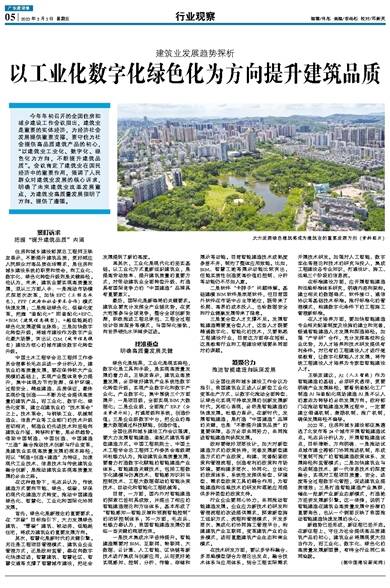 今年年初召开的全国住房和城乡建设工作会议指出,建筑业是重要的实体经济,为经济社会发展提供重要支撑,要守住为社会提供高品质建筑产品的初心,“以建筑业工业化、数字化、绿色化为方向,不断提升
