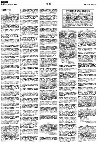 公 告 受委托,广州市银通拍卖行有限公司定于2023年05月12日上午8:00在公司拍卖厅公开拍卖下列标的: 广州市花都区合和东路27号(1、首层商铺,建筑面积126.21㎡;2、二至五层,建筑面积589.14㎡)。整体参考价(人民币)98.0万元,保证金(人民币)10.0万。权利性质:私有按份共有房产(不交吉)。 标的展示:2023年05月06-07日(标的所在地);保证金缴付:2023年05月11日前(银行到账为准);竞买登记:2023年05月12日拍卖会开始前; 注意事项:1、参加竞买实行实名制;2、资料备索,咨询电话:020-83324659 遗失声明 惠东县平山杰恩斯服装店,统一社会信用代码:92441323MA4YDXLY8T,遗失公章一枚, 现声明作废。 遗失声明 翁源县煌郡蔬菜专业合作社遗失行政章(4402290004539)、发票专用章(4402290005812)各一枚,声明作废。 遗失声明 广州云束生物科技有限公司遗失财务专用章一枚,现声明作废。 遗失声明 广州市彤颜美容科技有限公司遗失卫生许可证,证号:粤卫公证字[2022]第0105G02095号,现声明作废。 遗失声明 广州市花都区新雅西瓜货运代理服务店遗失公章一枚,现声明作废。 遗失声明 广州鹏辉汽车服务有限公司遗失公章一枚,现声明作废。 遗失声明 广州市白云区龙归李永民包装材料经营部遗失营业执照正、副本,注册号:440111601109036,编号:11913042641G,声明作废。 遗失声明 英德市大站镇一道茶茶叶店遗失营业执照正、副本,统一社会信用代码:92441881MA52255985,现声明作废。 遗失声明 广州华玖运输代理有限公司遗失营业执照副本,统一社会信用代码91440101MA59FMYD9B,编号S0612020030367,声明作废。 遗失声明 广州市花都区新华山本理发店遗失营业执照正、副本,统一社会信用代码:92440101MA5A454A88,现声明作废。 遗失声明 广州市埃威姆电子科技有限公司遗失公章一枚,现声明作废。 遗失声明 广州市番禺区南村歌诗丹顿美容院遗失营业执照正、副本,统一社会信用代码92440101MA59UEY7XA,注册号440126601718342,声明作废。 遗失声明 广州市增城区富利茶庄商行遗失营业执照正、副本,统一社会信用代码91440118MA7MYTNU6B,编号S2562022012568G,声明作废。 遗失声明 广州烽禾文化传播有限公司遗失营业执照正、副本,统一社会信用代码91440101596199566H,注册号440108000061983,声明作废。 遗失声明 广州市海珠区德棋小吃店遗失食品经营许可证正、副本,许可证编号:JY24401050467356,现声明作废。 遗失声明 广州市天润物流有限公司遗失公章一枚,现声明作废。 遗失声明 广州市越秀区斯淇斯丁鞋业商行遗失营业执照正本,统一社会信用代码92440101L60033923A,编号S0492017003948G,声明作废。 遗失声明 广州市白云区石井海泰电器店遗失营业执照正、副本,注册号:440111380053085,现声明作废。 遗失声明 广州仁和堂药业连锁有限公司福康药店遗失财务专用章、法人(刘伟珍)私章各一枚,现声明作废。 公 告 受委托,广州市银通拍卖行有限公司定于2023年05月12日上午8:00在公司拍卖厅公开拍卖下列标的: 广州市花都区叶榕街8号1区1栋521房,建筑面积49.93㎡。参考价(人民币)38.0万元,保证金(人民币)5.0万。权利性质:私有有限公司房产(不交吉)。 标的展示:2023年05月06-07日(标的所在地);保证金缴付:2023年05月11日前(银行到账为准);竞买登记:2023年05月12日拍卖会开始前; 注意事项:1、参加竞买实行实名制;2、资料备索,咨询电话:020-83324659 遗失声明 广州市花都区新华集鞋号鞋店遗失营业执照正、副本,统一社会信用代码92440101MA5A9XQL1J,注册号440121600539154,声明作废。 遗失声明 黄展军遗失广东水利电力职业技术学院普通高等教育专科毕业证书,证件编号:108621200806088733,特此声明。 遗失声明 广州市黄埔区联和街暹岗社区卫生服务站不慎遗失开户许可证正本,核准号:J5810019528304,现声明作废。 减资公告 广东祥源经典家具实业有限公司(统一社会信用代码:91440101074634794T)股东会决议,注册资本由原来10800万元人民币减少至1008万元人民币。请债权人自本公告见报之日起45日内向本公司申报债权,逾期不申报,视为放弃权利,本公司将向公司登记机关申请变更登记。 遗失声明 吴颖妍遗失营业执照副本,统一社会信用代码:92440101MA59P8XX2D,编号:S0492017010048G,现声明作废。 遗失声明 新国融(广州)管理咨询合伙企业(有限合伙)遗失营业执照正、副本,统一社会信用代码91440101MA9W0XKY8T,注册号440111005169492,声明作废。 遗失声明 新国融(广州)管理咨询合伙企业(有限合伙)遗失公章、财务专用章、法人(陈艳蓉)私章、合同专用章各一枚,现声明作废。 遗失声明 星腾现代农业(汕尾)有限公司遗失法人私章(石泽篇)一枚,现声明作废。 撤销公告 广州建达纸品包装有限公司撤销2022年11月14日、2022年11月14日在国家企业信用信息公示系统分别对外公示的清算组备案及债权人公告,并解散清算组。该公司继续经营,特此公告! 遗失声明 广州博之达贸易有限公司遗失公章、财务专用章各一枚,现声明作废。 遗失声明 广州市天河区沙东牧澳服装店遗失营业执照正、副本,统一社会信用代码:92440101MA5ADCXM9W,注册号:440106601178572,现声明作废。 遗失声明 广州市中聚盛益科技发展有限公司遗失公章、财务专用章、法人章(法人:刘坤艇)各一枚,现声明作废。 遗失声明 瑞本(广州)条码科技有限公司遗失公章、财务专用章各一枚,现声明作废。 遗失声明 广州瑞北服饰有限公司遗失公章、财务专用章各一枚,现声明作废。 遗失声