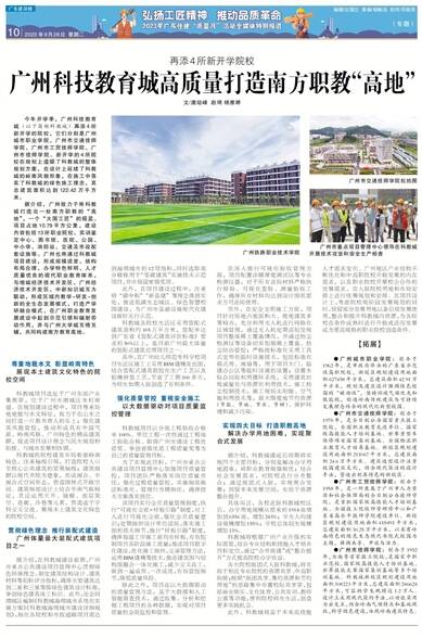 文/唐培峰 赵琦 杨雅婷 今年开学季,广州科技教育城(以下简称科教城)再添4所新开学的院校,它们分别是广州城市职业学院、广州市交通技师学院、广州市工贸技师学院、广州市技师