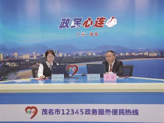 茂名市城市管理和综合执法局党组书记、局长李发(右)接听12345政务服务便民热线 |