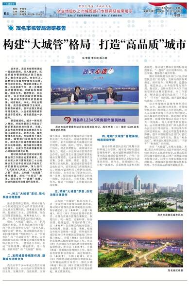 茂名市城管局调研报告 文/李发 李乐琦 陈小珊 近年来,茂名市按照精简统一效能的原则,深入推进市、区政府城市管理领域大部门制改革,整合市政公用、市容环卫、园林绿化等城市管