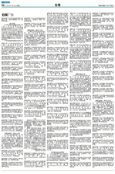 遗失声明 广州市友胜食品有限公司遗失公章、财务专用章各一枚,现声明作废。 更正声明 广州市花都祈福置业有限公司(统一社会信用代码:91440101761946247B),广州市祈福物流园经营有限公司(统一社会信用代码:91440101MA59ACTC4C),于2024年5月10日在《广东建设报》06版刊登了吸收合并公告,其中“合并后广州市祈福花都置业有限公司存续”中涉及的公司名称因笔误刊登错误,现更正如下:“合并后广州市花都祈福置业有限公司存续”。特此更正! 广州市花都祈福置业有限公司 减资公告 广州优奇科技有限公司(统一社会信用代码:91440101MA59Q8PE1K)股东决定,注册资本由原来50万元人民币减少至20万元人民币。请债权人自本公告见报之日起45日内向本公司申报债权,逾期不申报,视为放弃权利,本公司将向公司登记机关申请变更登记。 遗失声明 揭阳市电脑技术培训中心遗失营业执照正、副本,注册号:4452001000318,现声明作废。 遗失声明 揭阳市工业油料公司遗失营业执照正、副本,注册号:4452001000240,现声明作废。 遗失声明 揭阳市建设投资开发公司遗失营业执照正、副本,注册号:4452001000465,现声明作废。 遗失声明 揭阳市建设投资开发公司复印门市遗失营业执照正、副本,注册号:89336104-8,现声明作废。 遗失声明 揭阳市建设投资开发公司揭阳试验区分公司遗失营业执照正、副本,注册号:89041003-5,现声明作废。 遗失声明 揭阳市交通运输服务公司遗失营业执照正、副本,注册号:4452001000693,现声明作废。 遗失声明 揭阳市无线电通讯服务公司遗失营业执照正、副本,注册号:4452001000179,现声明作废。 遗失声明 揭阳市无线电通讯服务公司销售部遗失营业执照正、副本,注册号:89041556-5,现声明作废。 遗失声明 揭阳市无线电通讯服务公司保安器材经营部遗失营业执照正、副本,注册号:89336200-8,现声明作废。 遗失声明 揭阳市无线电通讯服务公司经营部遗失营业执照正、副本,注册号:4452001001017,现声明作废。 遗失声明 揭阳市外经企业供销公司遗失营业执照正、副本,注册号:19335761-1,现声明作废。 遗失声明 广州康宁教育科技有限公司遗失营业执照正本,统一社会信用代码91440101MA5D5W5L6T,编号S0612020021088G,现声明作废。 遗失声明 广州市番禺区林记塑料制品厂遗失营业执照正、副本,注册号4401262103366,统一社会信用代码914401017973641348,声明作废。 清算组备案、债权人公告 广州市金益控股有限公司,统一社会信用代码:91440114MAC4WF5Y8E,经股东会决议终止经营,现已成立清算组进行清算。清算组成员:陈禹升,清算组负责人:陈禹升。请相关债权人自本公告见报之日起45天内向本公司清算组申报债权,逾期不申报,视为放弃权利。清算结束后,本公司将向登记主管机关申请注销登记。特此公告。 遗失声明 广州市万尚文化传媒有限公司遗失营业执照正、副本及公章,统一社会信用代码91440101MA9UM5274Q,编号S1012023022930G,声明作废。 遗失声明 广州奥火休闲中心遗失发票专用章一枚,现声明作废。 遗失声明 广州烨络电子商务有限公司遗失营业执照正、副本,统一社会信用代码:91440101MA59G6UX96,现声明作废。 遗失声明 广州亿马汽车维修有限公司遗失法人(黄玮玲)私章一枚,现声明作废。 遗失声明 广州市白云区江高乐客商行遗失公章、财务专用章、法人(陈永杰)私章各一枚,现声明作废。 清算组备案、债权人公告 广州蝶恋花网络科技有限公司,统一社会信用代码:91440101MA59U46W9L,经股东会决议终止经营,现已成立清算组进行清算。清算组成员:何奎、江敬贤,清算组负责人:何奎。请相关债权人自本公告见报之日起45天内向本公司清算组申报债权,逾期不申报,视为放弃权利。清算结束后,本公司将向登记主管机关申请注销登记。特此公告。 遗失声明 广州柯荟贸易有限公司遗失营业执照正、副本,统一社会信用代码91440106MABMLT8X1D,注册号440106008942422,现声明作废。 遗失声明 广州柯荟贸易有限公司遗失公章、财务专用章、(吴晨坤)私章、(龙树靖)私章各一枚,现声明作废。 遗失声明 广州市白云区人和张颖怡熟食店遗失营业执照副本,统一社会信用代码92440101MA9UTRKN89,编号S112020089738,声明作废。 遗失声明 广州市皓泓电子科技有限公司,统一社会信用代码:914401016813199216;遗失公章一枚,现声明作废。 遗失声明 广州市花都区花东龙邦水族工艺厂遗失营业执照正、副本,统一社会信用代码92440101MA5AGXRA6K,注册号440121600943015,现声明作废。 遗失声明 广州市白云区松洲振和日用商店遗失营业执照正、副本,注册号440111600226812,统一社会信用代码92440101MA59X8TF3F,声明作废。 遗失声明 广州市越秀区莉典亚印刷服务部遗失营业执照副本,统一社会信用代码92440101L88792948T,编号:S0492015032330G,现声明作废。 遗失声明 广州市昌兴工业气体有限公司(统一信用代码号:91440101MA9Y8C9241、执照编号:S1212021046804G(1-1))遗失了广州市黄埔区市场监督管理局于2023年12月11日核发的营业执照正本、副本(1-1),声明作废。 遗失声明 广州市岭南实业有限公司流花商贸城遗失营业执照正、副本,统一社会信用代码91440104MA5CEC8U2H,注册号440104000306828,声明作废。 公告 我单位于2024年5月21日位广州市南沙区黄阁镇小虎沥红树林附近海域查获一艘疑似“三无”船舶的单机快艇,现场无当事人。经联合勘验核查,认定该快艇为“三无”船舶。 根据《国务院对清理、取缔