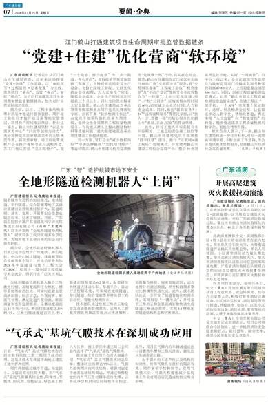 广东建设报讯 记者唐培峰报道:日前,“气承式”基坑气膜技术在深圳市眼科医院二期工程项目成功应用,这是该技术在我国华南地区建筑工地中首次应用。 项目两侧临近城市干道,场地狭小,且临近原有住院大楼。而“气承式”基坑气膜兼具防尘性、降噪性、节能性、防火性、智能安全、绿色施工的六大优势,施工单位中建三局二公司最终选择了“气承式”基坑气膜技术。 据该施工单位项目负责人谢毅介绍,“气承式”基坑气膜技术防尘降噪,整体防尘效果达95%以上。气膜外部利用斜向网状结构,将膜材固定于地面基础结构周边,并通过维持稳定的内外气压差对膜体进行支撑,以形成净空的封闭空间隔绝作业扬尘。此外,项目在气膜内的车辆通道进出口设置洗车槽和三级沉淀池,避免出入车辆带泥上路。 由于膜材的不透声性以及结构的封闭性,使得气膜具有很好的隔音效果。项目紧邻学校和住宅,应用气膜技术后,可最大程度地减少基坑施工作业对周边居民造成的扬尘噪音影响。