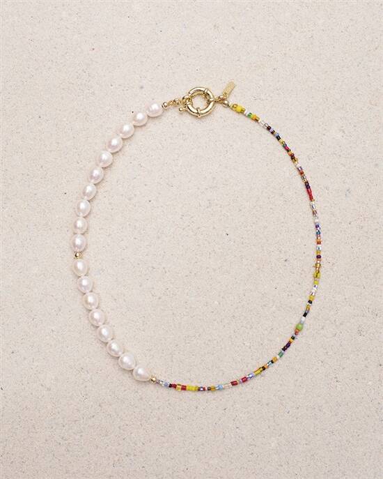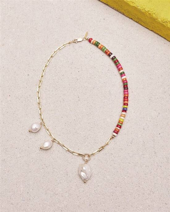éliou的彩色童趣感,令不少消费者着迷,其中彩色珠子串连而成的链条,颜色绚丽又趣味十足,正是它们的品牌的一大特色之一,每个喜爱éliou的朋友,首饰盒里都少不了这抹缤纷的色彩。极致的红、绿、黄,或是不同色彩不规律分布的设计,看似随意地串起链条,依然少不了品牌主打的珍珠元素点缀其中。虽然是简单的链条造型,但不同颜色的组合也能叠戴出不同风格,或是再大胆些,把项链缠绕在手腕上,项链瞬间变身成为手链,在佩戴方法上,éliou给了消费者很大的发挥空间。