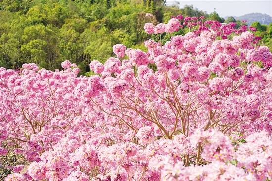 紫花风铃木又称紫绣球,原产巴西、巴拉圭、阿根廷等中南美洲国家同地区,每年11月开始落叶,1月底开始开花,花期一般有3个月左右。江门嘅紫风铃花海有两个地方,都唔算係景区,但因为紫花风铃的缘故,每日都可以吸引上千人游览。一个係新会山头坪嘅绿美生态园,规模比较大,花海里面有唔少配合大家影相嘅摆设台凳,加上弯曲山路航拍会好震撼。另一个係新会罗坑镇潭冈村嘅林场,规模相对较小,不过对于郊游影相已经好足够。其实两边都啲紫花风铃园圃,门票只需30元,约等于买咗一棵树苗,就可以喺里面游玩影相。