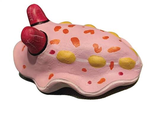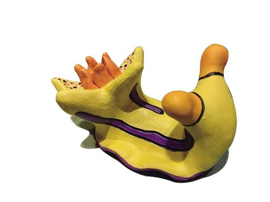 眼利嘅你会发现阿鸿的陶土作品中,具有叠加装饰色彩的美感,佢强调粗糙嘅机理触感,陶土质朴无华而且带着粗旷。当我们见到"变色龙"系列作品嘅时候,色彩斑斓嘅效果同立体嘅装饰面,好快就能令我哋喺作品中感受到缤纷大自然的生机盎然,圆碌碌凸起的眼仔充满疑惑与惊讶,仿佛幽默的喺度讲述哏佢嘅小故事。呢种令人过目不忘嘅感觉,成功唤起了观众的内心世界与小怪兽之间的联系。然而,阿鸿近期嘅海底小生物-海蛞蝓,软软懒懒的样子。作品率性、朴素又单纯的颜色,搭配上坚韧的深色线条和脉络,附着于身体,加上十分富有音律和理性的曲皱转折的裙边,体现作品特有的禀性,它很真实,又有距离,它丰富又有个性,大粗线条仿佛在吟唱自然之歌。