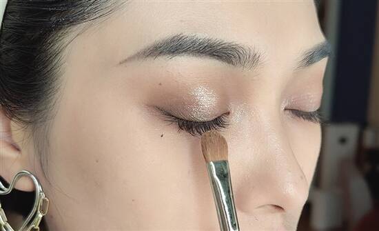 2 细闪 在上眼皮的中部叠加香槟色细闪粉,营造bling bling的清透感。