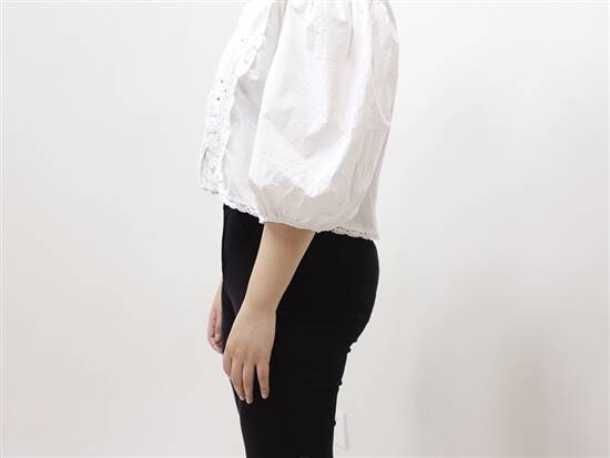 大泡泡袖、整体短版且宽松的上衣会加重上半身的外扩感,造成视觉上的"膨胀"。紧身裤包裹臀腿,对于下半身线条不流畅的女孩来说"雪上加霜"。