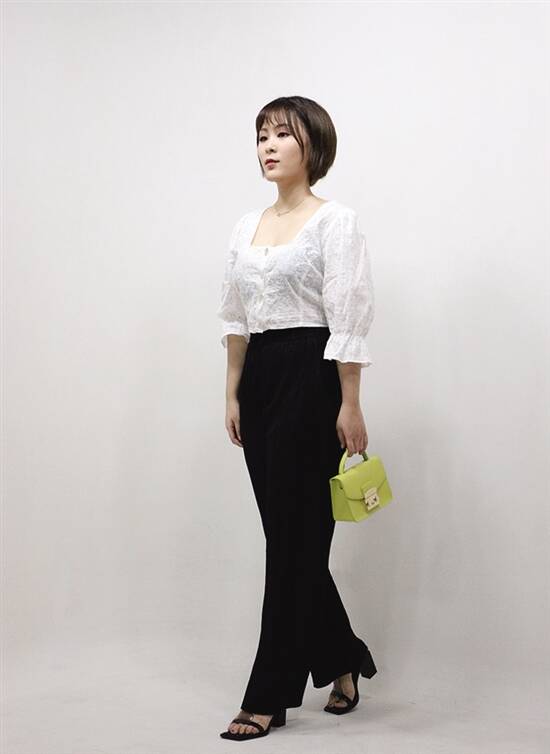 微泡中袖从视觉上延长手臂,方领更显脖子细长。下身垂感高腰阔腿裤提高腰线,拉伸、修饰腿部线条,减重又显高。