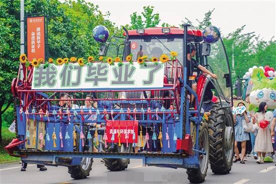 华中农业大学嘅礼物够嗮特别!每个学院装扮专属特色拖拉机,组成“钢铁长龙”喺校内巡游。此外,仲有无人机表演、鼓阵表演和小提琴曲助阵,仪式感满分!