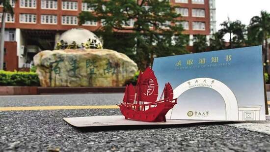 通知书采用庄重的蓝绿色,海洋是暨南文化的背景起源,远洋帆船是百年侨校的视觉图腾。送给新生的记事本,以立体纸雕的形式展现暨大丰富曲折的光荣历史。