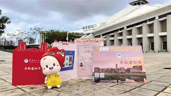 录取通知书邮折通知书为三折页形式,邮折以红色、淡黄色为主色调,融合了“一校三区”特色建筑元素,寄送以校园风景制作的四联小型邮票。