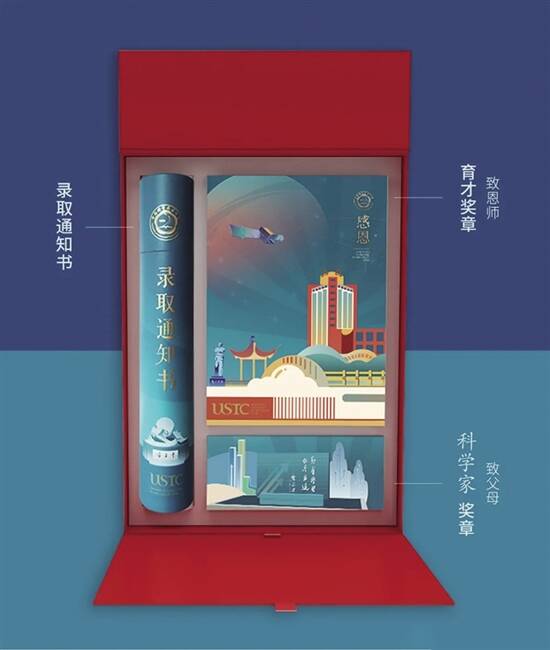 通知书分为“致青春”“致父母”“致恩师”三个主题。被录取的学生将收到一个红色礼盒,内含圆筒状录取通知书、“科学家”奖章和“育才”奖章。“科学家”奖章赠与父母,感谢他们含辛茹苦的付出;“育才”奖章感怀师恩,向老师致以崇敬的问候。