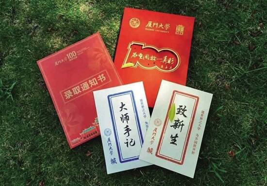 厦门大学建校百年,学校推出了百年校庆版通知书。和本科录取通知书一同发放的有两封信。第一封信装着一百年前陈嘉庚的演讲词摘要。第二封信则装着鲁迅、陈景润两位大师的手记。最后,能看到镂空处凸显的七个字:“为吾国放一异彩”,饱含对录取考生的美好希冀。