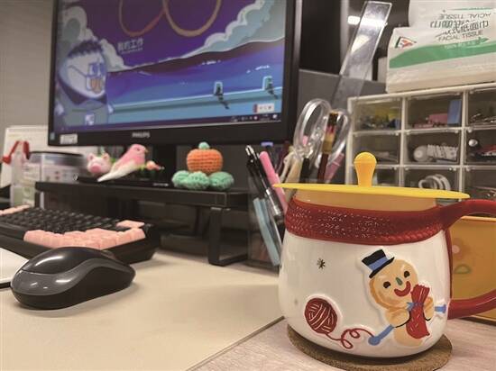 电子宠物係一位十分追求精神愉悦的选手,佢嘅工位睇落唔算太出彩,其实好多细节位都有自己嘅小心思噶。佢认为最实用嘅单品当属人手必备嘅台历,选择有备忘录设计嘅台历,可以方便记录待办事项的DDL。水杯、摆设等小物件,电子宠物就喜欢比较明亮色系,超可爱的雪人水杯,好意头的针织大桔……望多两眼呢啲缤纷摆设,心情靓啲,疲劳都好似消减咗啲。
