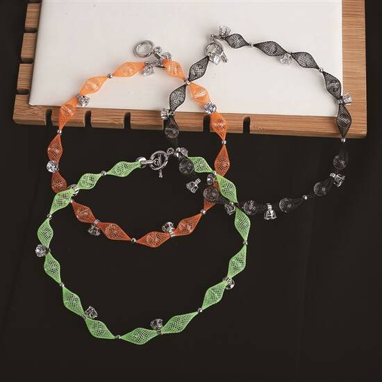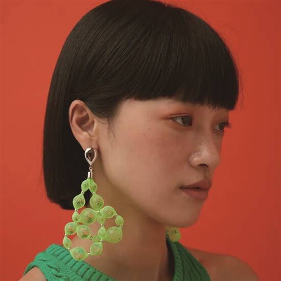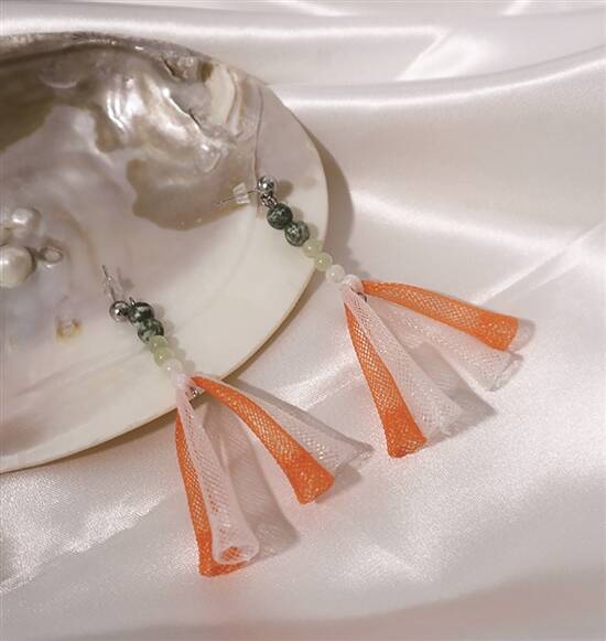 网纱材质因为结构特别、质地柔软,自带蓬松感又有立体塑型格支撑力,十分容易拗出各种造型的饰品来。将管状网纱绕成两个交错嘅圆圈,即刻係设计感耳环;两条长网纱交织,马上成为立体感发箍;捏成波波串链嘅颈链都好有味道。喺中空嘅网纱管中放入珍珠、玻璃球等等晶莹剔透嘅填充物,仲可以令首饰变得更闪亮吸睛,唔同颜色、材质嘅搭配都能带来一啲惊喜效果。网纱镂空嘅特性,令佢嘅材质好轻身,颜色鲜艳但一啲都唔夸张,大家搭配起嚟都唔会有压力噶。