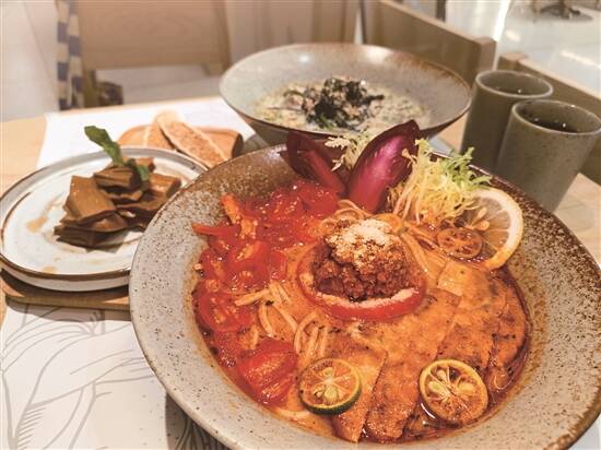 “囍素莳”专注做好一碗面,主厨也好俾心机研发出品,食材讲求新鲜,蔬食面都能玩出咗好多花臣。翡翠丸子豆乳荞麦面,素丸子加入菌菇,口感丰富,弹牙程度不输肉丸,绿色嘅手工荞麦面原来係融入咗菠菜汁,一入口,清新的蔬菜味让你仿佛置身于田园中。日晒番茄浓汤荞麦面绝对系酸辣爱好者的首选,多种甜酸比例各有不同嘅番茄汇聚于一碗面中,让人回味无穷。麻油香煎菇扒荞麦面,伴着麻油香气,半掌长度的菇扒一口下去,口感肥厚可媲美鲍鱼。据创始人介绍,佢哋仲会根据时令陆续推出不同新品,小编已经开始期待下一个新品啦!
