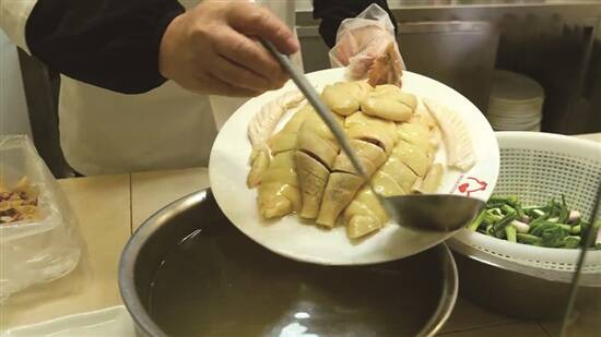 听到师傅整鸡嘅卤水咁把炮,阿廉梗係心动,想趁机买啲“半成品”翻去,到时喺屋企人面前威下咁啵,但师傅就话,呢煲秘制卤水唔卖嘎!“偷鸡”唔成,阿廉就唯有现场食翻够本啦。师傅真係将“一心一意”嘅宗旨发挥得淋漓尽致,除咗对制作流程嘅坚持,斩鸡也很有技巧,而鸡肉上枱之前仲用卤水淋一次,保证佢最juicy嘅状态,甚至连点鸡嘅姜葱酱的配比都有讲究。师傅仲偷偷话俾我哋知,原来鸡pat pat数上去第三块係最正啵。师傅将各种白切鸡心得铭记于心,同时又大方share出嚟,为嘅就係希望呢碟白切鸡美名远扬,令更多人感受到粤菜文化嘅真香魅力。曹永廉亦感叹道:“广式白切鸡制作技艺能传承至今,经久弥香,全靠师傅的细心和坚持。”
