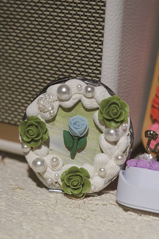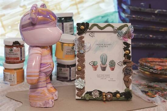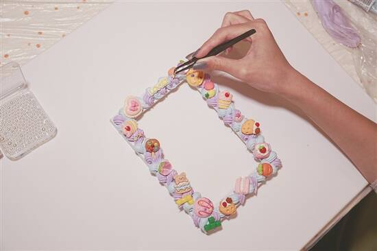 睇住之前想好的设计图,把零件放插入奶油胶中,再用手指轻轻往下压实。用糖豆、星星、爱心等小零件点缀,帮相框加啲“高光”。