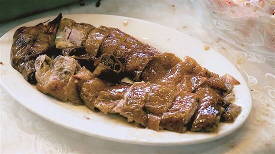 古井烧鹅是广东省江门市新会区的一道广府名菜。因为皮脆汁美、肉香甘甜而深受食客喜爱。正宗嘅古井烧鹅係依据南宋宫廷秘方制作的,同其他地方嘅烧鹅相比,佢嘅皮相对较薄,焦色中透出金黄,食起身特别酥脆。古井烧鹅嘅甜味,来自秘制腌料中的蜜糖;而佢诱人嘅香气,则係来自腌料中特别加入的新会特产——陈皮,再混合荔枝柴熏烤而成。古井烧鹅制作嘅工艺,传承至今已经有700年历史,已经被列入了广东省第八批省级非物质文化遗产代表性项目名录。