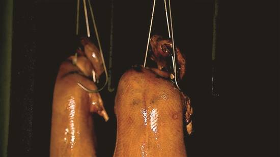 要烧制一只咁香喷喷嘅古井烧鹅,就前期制作都有六步,每一步都唔可以马虎。第一步,选用饲养咗50至60日嘅开屏马岗鹅做原材料,因为养育咗呢个周期嘅鹅,制作出嚟嘅烧鹅肉实而皮不老。第二步,老师傅借助软皮管,用口将空气吹入洗净、掏空嘅鹅腹腔,这是最古老嘅充气方式,不过依家为咗更卫生方便,已改用机器充气。充气係为咗令鹅身膨胀受热均匀,成品先可以呈现皮肉分而不离嘅状态。第三步,将秘制嘅酱汁均匀涂抹鹅腹腔后,往里填充腌料,再用特制的针线将缺口缝好。第四步至第六步要相当连贯,概括来讲,就係滚水烫皮要手快心细,上糖皮要面面俱到,最后将腌好嘅鹅挂入烧红的荔枝木炭炉度。咁样先算係完成咗烧鹅的前期制作。