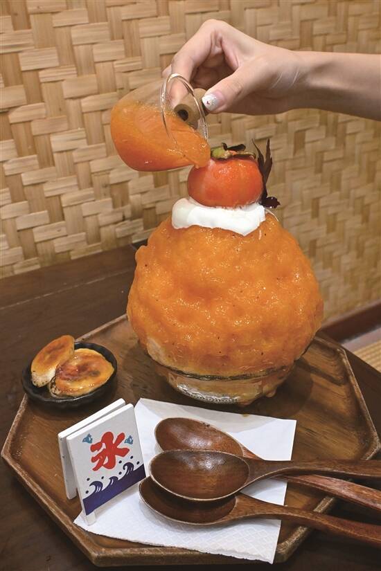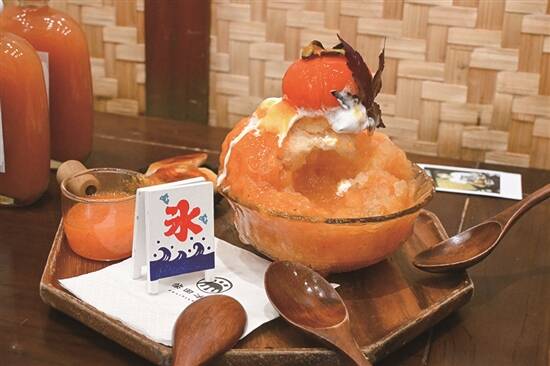 11月嘅广州仲係热热哋,大家可以用秋天的水果品尝到夏天的快乐:嚟翻啖柿子刨冰啦!“柴田冰寮”近段时间推出的“柿子全家宝”套餐,吸引唔少朋友嚟打卡。套餐内就有店内招牌的“一整颗柿子茉莉绿茶刨冰”,今年一返场就好受欢迎。店长选择用口感独特的鹅绒冰,每日限量十份,顶部有一颗冻硬去皮的柿子,造型上足够吸睛。刨冰表面倒上新鲜的“鸡心软柿子酱”,再搭配首创嘅茉莉绿茶冰砖茶底,柿子的鲜味与浓郁清香的茉莉绿茶相融合,入口爽神、冰甜无比;匙羹继续往下挖,脆脆的椰子片唤醒味蕾,再碰上滑捋捋脆波波嘅果冻,口感丰富又有层次。“海盐流心柿子卷”用伯爵茶香和海盐奶油搭配,中间夹着浓郁的软柿子酱,饱肚且不甜腻。最后,再点杯“柿子乌龙茶”,满嘴都有柿子的清香。主理人静雯表示,直接用鲜果做甜品,最大的难题是水果受季节限定,比用果酱做原料更难,新品需要反复调试,才可以保证水准。