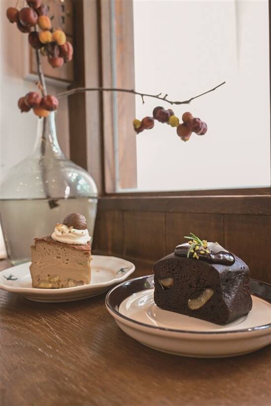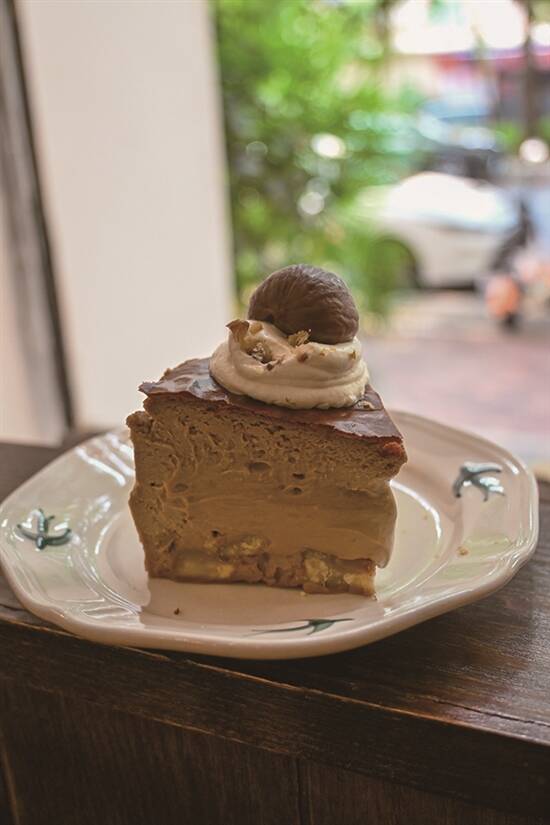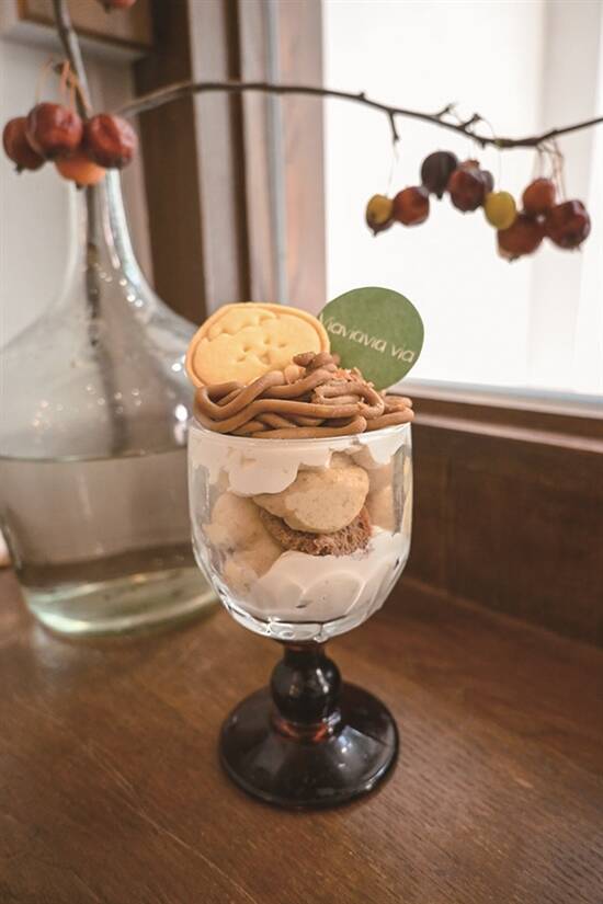 秋日到来,好多甜品店都有推栗子主题的新品,日式复古风格嘅Via·製菓的栗子主题美食都很特别,配上深棕色系带点高冷的店面,特别有秋日氛围。分量满满嘅“栗子自然风”,起初因为造型随意,所以名都起得随意,但杯内其实真材实料、充满小心思。底部有奶油包裹栗子泥,同面包胚混合,口感香甜绵软。顶部撒上栗子蓉,啖啖有惊喜。返场嘅“栗子布朗尼”,味道醇厚,热量充足,十分适合大家秋冬补充能量。店家之前出过嘅柠檬红茶巴斯克,因为用了栗子做原料,变身成为“栗子巴斯克”,顶部嘅一大粒栗子同浓郁芝士味道相融,口感稍微偏酸,风味都几独特。想滋润一啲,可以点翻杯“苹果肉桂饼茶”,苹果切粒和肉桂结合,嚼起来有淡淡的清香,味道清爽解腻。