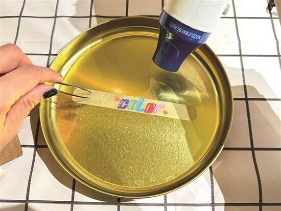 4.提前用热风枪将铁盒预热,将画好的热缩片放入铁盒后,吹风枪从热缩片一角、一个方向吹起。热缩片先缩后舒展,舒展开就是热缩定型的时候。