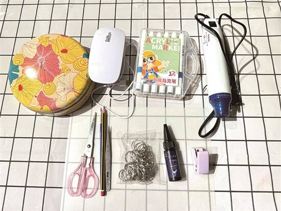 1.材料:热缩片、热风枪、彩色马克笔、剪刀、铁盒、打孔器、uv胶、烤灯、挂扣、镊子