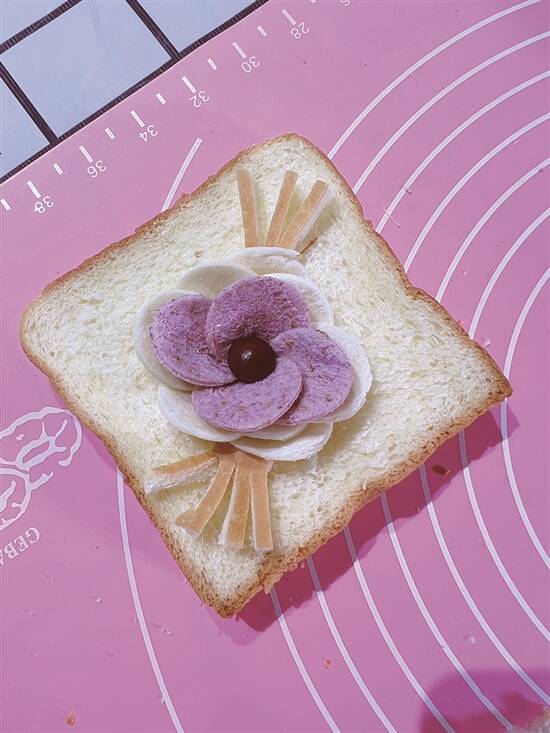 一片片嘅方包,除咗可以做“画布”彩绘图案之外,仲可以变成“手工纸”,加少少创意,令佢变得立体起身。用压平的面包片当“手工纸”,更方便整造型,切出嚟嘅面包边可以留住做后期装饰。用樽盖压出圆形面包片花瓣,层层叠加面包片,面包花就会更加有层次啦。装扮立体花花面包时,花朵周围可以用面包边修剪出来的流苏、小叶子做装饰,再用一粒朱古力豆做花蕊,立体嘅花花面包就做好啦。如果中意脆口吐司,可以将成份作品送入烤箱,烘烤之后朱古力花蕊会变成流心,微焦嘅面包片卜卜脆好过瘾。