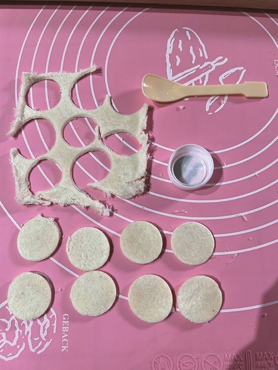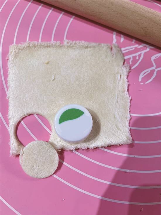 2、压出圆形片:用洗干净嘅矿泉水樽盖印出圆形嘅面包片花瓣。