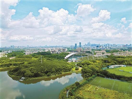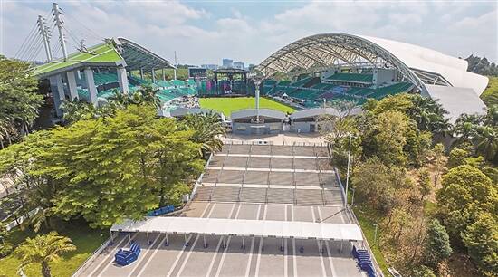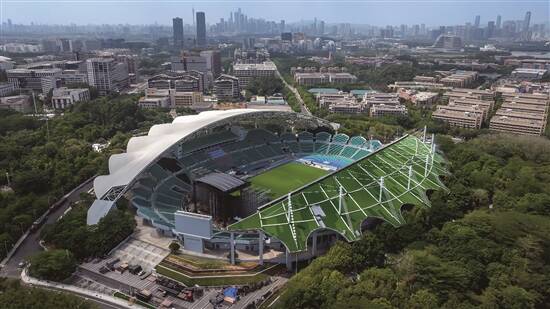 拥有圆形穹顶设计嘅广州大学城体育中心,极具摩登感,係大学城的标志建筑之一。自建成以来,这里先后举办过东京奥运会七人制橄榄球亚洲区资格赛、足球世界杯亚洲区预选赛等赛事,见证了获奖体育健儿的荣耀时刻。在“十五运”中,佢将承办U16女足与越野轮滑项目的比赛。目前,体育中心主场馆已将跑道升级为国际标准,草坪更新为国际足联认证的草茎,为运动员打造专业竞技环境。新增的两块LED大屏,助力观众沉浸式感受比赛,确保大家舒爽咁参与“十五运”。值得一提嘅係,为咗拓宽运动空间,喺呢次场馆升级中,设计师结合大学城中心湖公园与周边自然山体,在场馆外整合出一座开放式生态体育公园。园林设计融入岭南特色,为游客提供“运动+自然”的休闲空间,进一步落实“全民运动,激情全运”的理念。