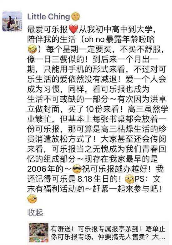 相信对于好多人嚟讲,可乐报係陪伴大家成长嘅一个印记。或者而家嘅你未必会好似以前咁每期上新必入手,不过成世人流流长,有啲人和事陪伴过就已经好足够。今次专属报亭嘅推出,就係希望畀大家重拾旧时可乐报一出新就冲去报亭买嘅童年回忆!报亭就够晒COLORFUL啦,仲集合新旧可乐报,想影怀旧风嘅大片顷刻就有。自上期开始,我哋都陆续收到唔少COLOR FANS嘅打卡反馈,我哋一齐去片啦! 彭琳/文、部分图 许家铃/模特 部分图片由读者提供 随时影 随心拍 喺正地王广场对出马路嘅专属报亭,地址就够晒就脚啦,平时出去行街经过,就可以开始你嘅表演。无人售卖嘅设定,令你可以想点影就点影!从大家send过嚟嘅相中,可以睇到报亭两侧嘅吹水版,出镜率係最高嘅,睇嚟大家都中意做“影后”多啲啵。如果想抢镜啲,大家不妨带多支马克笔,一边写低你嘅“绝世金句”,一边摆pose影相,绝对够晒煞食! COLOR陪伴一路前行 COLOR嘅专属报亭,暂时只此广州呢一家,广州以外嘅COLOR FANS,想话过嚟打卡就可能会冇咁方便。但咁都无法阻止大家嘅热情,唔少读者透过留言分享佢哋同可乐报嘅故事,睇翻大家嘅留言先知,原来可乐报成为大家求学时期生活嘅一部分!睇得出,呢次嘅专属报亭都勾起咗唔少大家嘅回忆,你哋嘅支持COLOR通通收到晒,全部在心中! 陀地KOL嚟撑场! 喺急速嘅生活节奏下,静静地坐低睇晒一份报纸似乎係一件好奢侈嘅事。难得有个报亭有齐近几年嘅可乐报,买翻去睇又得,坐喺报亭呢度睇都得,最紧要大家睇得舒服!咁正嘅可乐报新窦,我哋广州本地嘅KOL“味成年阿辉”戴明辉亦有过嚟撑场,见佢睇到咁入神,心思思嘅你要唔要join埋一份啊? 《可乐生活》专属报亭 地址:较场西路地王广场西门户外平台(近中华广场) 开放时间:14:00-19:00 全年订阅可乐报好easy! 除咗去专属报亭打卡之外,你都可以轻松喺屋企就get到全年嘅《可乐生活》!只需要¥60蚊,每个月新鲜滚热辣送上门! 1、长期订阅方式 (*以下方式随邮局派送到家庭信箱,请确保信箱能正常使用) ①通过中国邮政派送 进入中国邮政微邮局→在主页菜单中选择“报刊订阅”→输入《可乐生活color》或邮发代号:45-155→即可自由选取时段进行订阅! ②通过金羊发行订购 拨打电话(金羊发行公司):020-8713 3333→直接向对方表示需要订阅《可乐生活Color》,留下联系方式即可 2、单期购买 (*以下方式将以快递的形式寄送,请确保联系电话畅通) 微信小店:可乐生活COLOR小商店 淘宝小店:羊晚生活馆