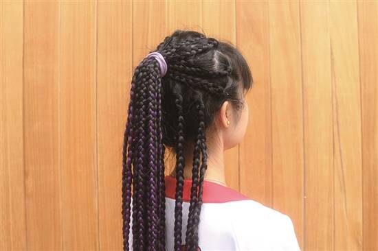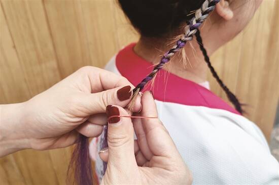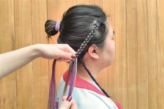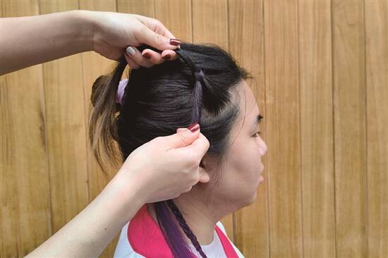 ⑤编发 将真、假发分成3股,按正常3股辫嘅编法顺势编制就可以了。 |
