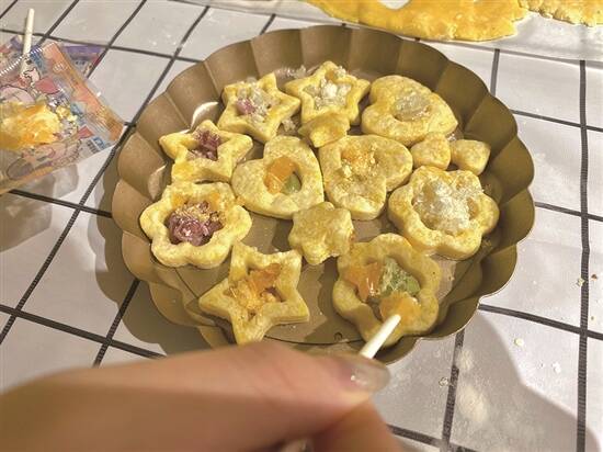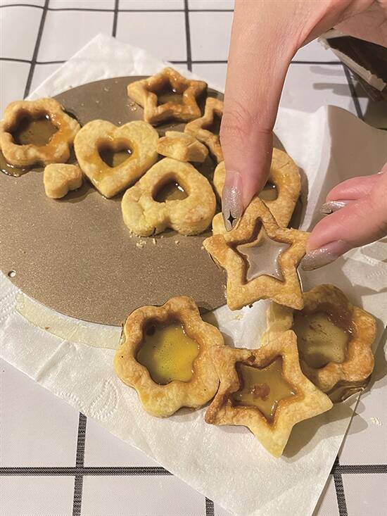 夏日甜品主打清凉解暑,入秋后的甜品就会多一点温暖,有丰收的意境。可乐君今次在Color厨房秘密练兵咗好几日了,就係为大家准备秋天第一场下午茶,甜甜蜜蜜和秋天约会啦! 汤唯闻/文 吴雨晨/图 肉桂苹果派 苹果的清甜加上肉桂的醇香,就好似秋天落叶围绕喺温暖嘅篝火旁边,散发出焦糖的香味。食材准备简单,制作方法简便,出品低糖无油、香气逼人、健康减脂。造型很重要,所以喺烘培过程中,我哋可以准备小巧别致的挞盘、派盘,咁样烘烤出来甜品会更加精致。 材料准备:低筋面粉10g、泡打粉1.5g、白砂糖8g、牛奶50g、鸡蛋一个、适量肉桂粉。 1将牛奶和鸡蛋分次倒入粉类混合物中,搅拌均匀直至面糊顺滑无颗粒状。 2将一半苹果切成片状,如果想苹果香味浓啲,可以适量加重苹果切片的比例。 3铺一层苹果片喺模具中,再倒一层面糊,以此类推一层苹果一层面糊,直到铺满模具。 4放入预热好的烤箱,设置185度30分钟。 5成品出炉后,可以再加啲肉桂粉提味。 玻璃糖饼干 玻璃糖饼干好玩、好睇又好吃,绝对会係秋天下午茶中嘅颜值担当。糖果变身成五彩“玻璃”,镶嵌入各种形状可爱的饼干,呢份甜度即刻升呢!成品卖相已经好靓,举起来一睇,眼前的世界马上多了一层秋天滤镜,它自己本身作为道具,都相当出片。 材料准备:低筋面粉120g、糖粉40g、黄油50g、蛋黄一个、水果糖若干。 1将食材全部混合搅拌成面团状。 2将面团放喺烘培纸上擀成薄片,如果放入冰箱冷藏一阵,会更好塑型,方便用饼干模具时脱模。 3用模具喺面团上压出喜欢的形状后,再用小一号的模具将中间掏空,放入烤箱,设置170度烤5分钟,就可以充分定型。 4拿出烤好的饼干框架,将喜欢的糖果放入中间镂空的位置,再放入烤箱,同样设置170度烤5分钟,让糖果融化。 5要等待饼干凉透之后,再拿起来拍照和品尝。 “能量”软曲奇 曲奇之所以係烘焙爱好者的入门款,是因为佢的可塑性强、包容度高,只要材料备足、搅拌均匀,就可以根据自己的喜好,喺曲奇中加入各种各样的食材,制作各种各样的口味。带着坚果、巧克力香味的软曲奇,温暖又有力量,一个就能填饱你的肚子! 材料准备:黄油70g、细砂糖50g、全蛋液60g、低筋面粉120g、泡打粉4g、适量坚果和巧克力。 1将准备好的食材全部混合搅拌均匀,分成两份面团,可以按照自己喜好准备其他口味。 2面团分成六个小面团,加入喜欢的坚果或者巧克力进行装饰。面团放入170度烤箱烘烤10分钟。 3最后撒上一啲肉桂粉,可以增添风味。