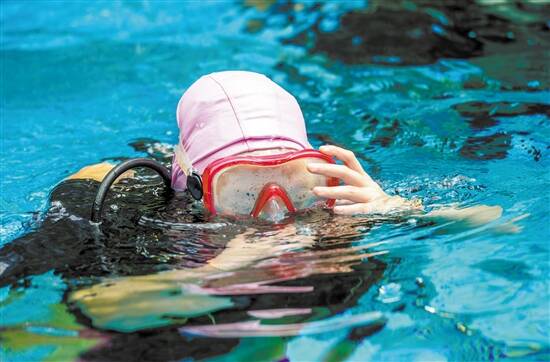 教练一边为乐乐示范,乐乐爸爸潘先生一边在岸上紧张地观看。潘先生欣喜地发现,以前不敢水中闭气的乐乐,一步步尝试,一步步突破,在教练循循诱导下,终于成功潜入水底。“很欣慰,这是她学游泳一个月以来的最大突破。”潘先生如是说。