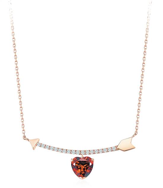 精选的爱心形石榴石,颜色浓烈而饱满,18K玫瑰金锻造的精致“丘比特之箭”将两人的心连在一起。整枚项链既有甜蜜气息,又不过分甜腻,当做日常佩戴珠宝也很合适。