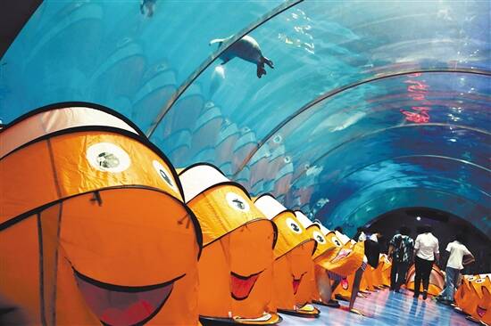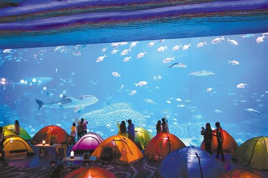 长隆海洋王国推出多项创新的寓教于乐海洋科普体验项目,其中“海底夜宿”可以走进鲸鲨馆与多条世界上最大的鱼类——鲸鲨“共眠”,体验与日间完全不一样的奇特旅程。在最大的亚克力板前面搭起帐篷,还可以一家人住在驾于海洋馆隧道结构之上的最大的水底观景穹顶底下,魔鬼鱼、锤头鲨等等两万多条珍稀鱼类在头顶游过,瞬间满足大小朋友的“鲸鲨英雄情结”还有“美人鱼梦”。父母伴着音乐,给孩子讲身临其境的睡前海洋故事,感受夜晚海底的神奇。特别是对于小朋友来说,专业讲解员科普的海洋鱼类知识小课堂是非常好的科教与亲子体验。项目中,科普专家还将带领游客,到访海洋王国第二大的动物展馆——海牛馆,探索亚马逊流域的古老故事,与在长隆诞生的全国首例西非海牛宝宝打招呼,一起追溯美人鱼的传说。需要温馨提醒的是,“海底夜宿”设置深海区、海景区、海底区三大视觉夜宿体验,为保证游客的海底体验质量,每日限量推出购票数量,逢周一展馆维护“海底夜宿”暂停开放。