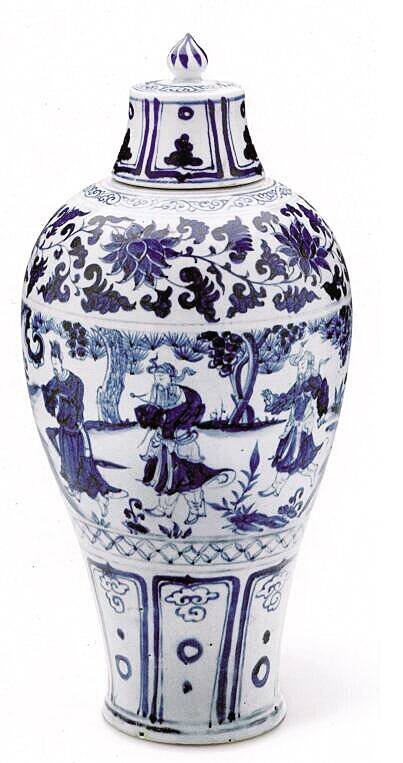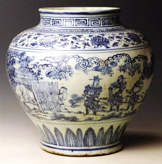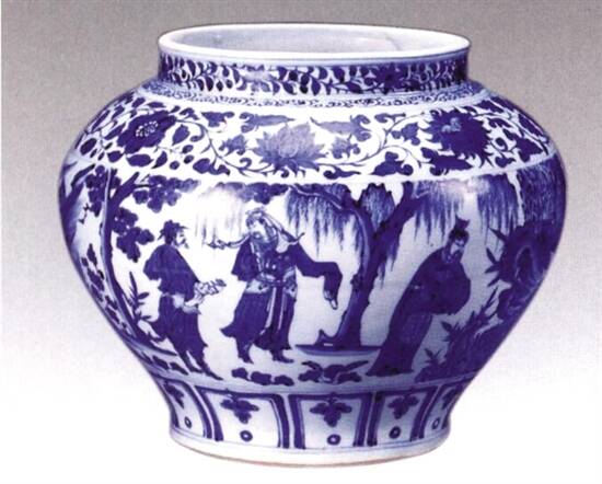 元 青花三顾茅庐图大罐 (现藏于英国裴格瑟斯基金会,根据叶佩兰著《元代瓷器》,北京九州图书出版社,1998年版,第56页)