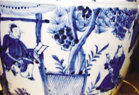 该大罐高27.6厘米。腹部以精湛的绘画工艺再现了三顾茅庐的历史故事画卷。其采用了进口“苏泥勃青”料绘制,青花发色青翠浓艳。主画面诸葛亮身穿长袍,盘膝坐在松树下,一书童双手捧书匣站立一旁,左前方一童子正倾身禀告。