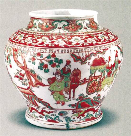 明·正德至嘉靖 景德镇窑红绿彩三顾茅庐图大罐 (2001年山西省长治市惠丰厂明墓出土,现藏于长治市博物馆。根据张柏主编:《中国出土瓷器全集·5(山西)》,北京科学出版社,2008年版,第227页。) 该大罐高28.8厘米。造型为圆唇,矮颈,丰肩,鼓腹下部内收,近底部外撇出一周浅台。腹部主题部分以红绿彩绘制三顾茅庐人物故事纹,色彩艳丽,画工精细,人物表情生动,个性鲜明,堪称此类题材又一杰出力作,也代表了当时瓷绘艺术的水平与特色。