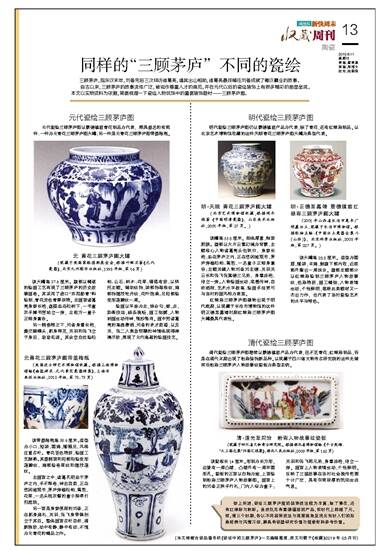 三顾茅庐,指东汉末年,刘备先后三次拜访诸葛亮,请其出山相助,诸葛亮最终辅佐刘备成就了蜀汉霸业的故事。自古以来,三顾茅庐的故事流传广泛,被视作尊重人才的典范,并在元代以后的瓷绘装饰上有很多精彩的画面呈现。本文以实物资料为依据,简要梳理一下瓷绘人物纹饰中的重要装饰题材——三顾茅庐图。