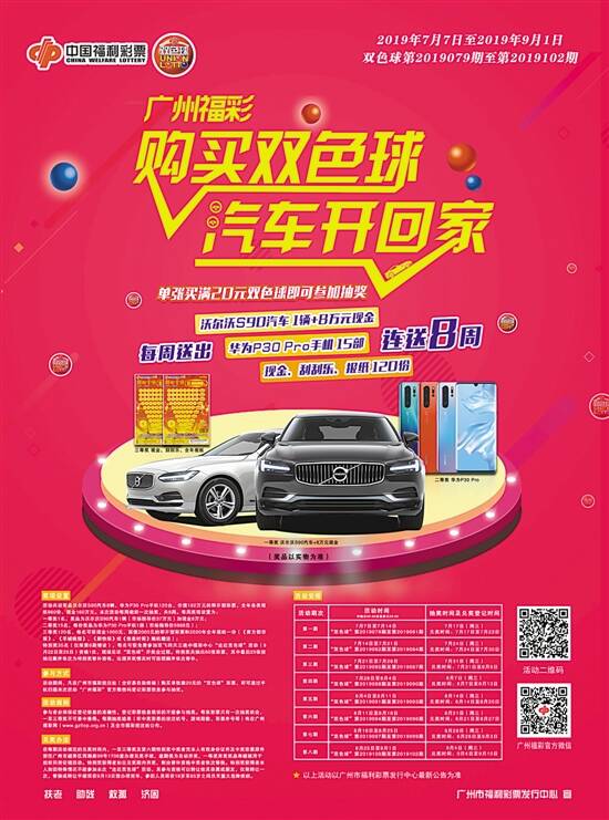 第七期抽奖仪式结束后,“购买双色球,汽车开回家”仅剩1期,活动将于9月1日正式结束。目前还剩余1台沃尔沃S90小汽车、15部华为P30 Pro手机和120个千元现金奖等奖品待送出,参与活动规则的是,在广州全市福利彩票投注站(含好易自助终端)购买单张满20元的双色球彩票,用手机发送符合条件的彩票信息到指定平台,即可参与登记抽奖,最高可赢得价值37万元的沃尔沃S90汽车及8万元现金大奖。第八期抽奖仪式将在9月4日上午举办。