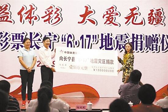 9月1日,“6·17”震后第77天,“公益体彩·大爱无疆”中国体育彩票长宁地震捐赠活动在长宁县会议中心如期举行。国家体彩中心党委书记、副主任曾志刚在捐赠仪式上表示,此次活动中,国家体彩中心与四川体彩中心、重庆体彩中心一道,向长宁县慈善总会捐款100万元,尽体彩人所能,为长宁灾区的百姓送上关爱和祝福,帮助受灾群众尽快恢复正常生产生活秩序。与此同时,9月1日恰好是学生们返校上课的日子,重庆体彩中心还贴心地为受灾严重的梅硐小学的孩子们送上了一份“开学礼物”——价值10万元的体育器材,期望运动能让孩子们尽快走出地震阴霾,期望锻炼能让灾区儿童也享有健康快乐的童年。