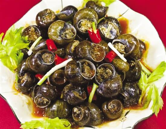 田螺酿肉是阳朔当地特色之一,阳朔的田螺得天独厚,个头特别大,有的甚至有乒乓球大小,肉质肥美,为制作田螺酿提供了必要的先天优势。