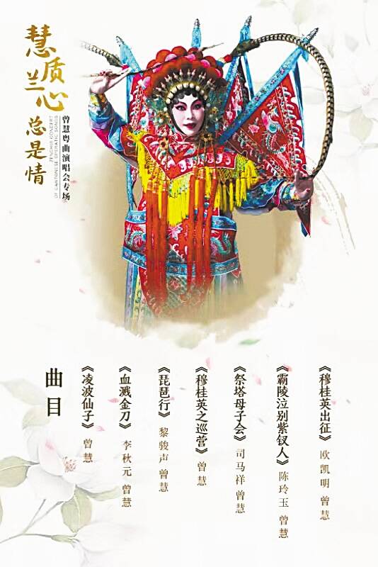 曾慧广州演唱会由广东粤剧院音乐总监万霭端担任总策划,“千面老倌”彭炽权作为特邀司仪。一同登台演出的欧凯明、黎骏声、陈玲玉、李秋元、司马祥等都是粤剧界响当当的名牌唱家。(管瑜)